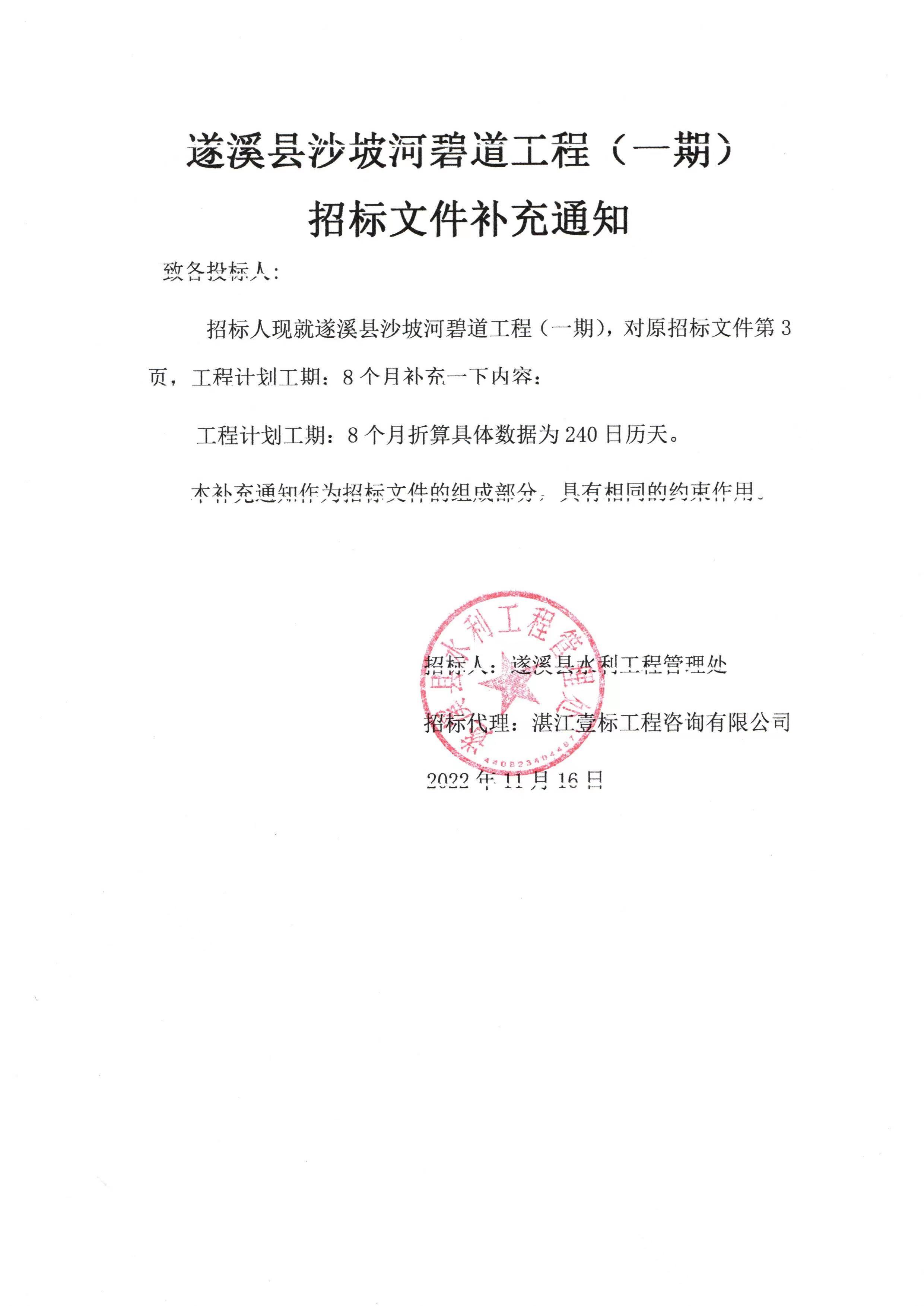 招标人现就遂溪县沙坡河碧道工程(一期),对原招标文件第 3页,工程计划工期: 8个月 补充一下内容: