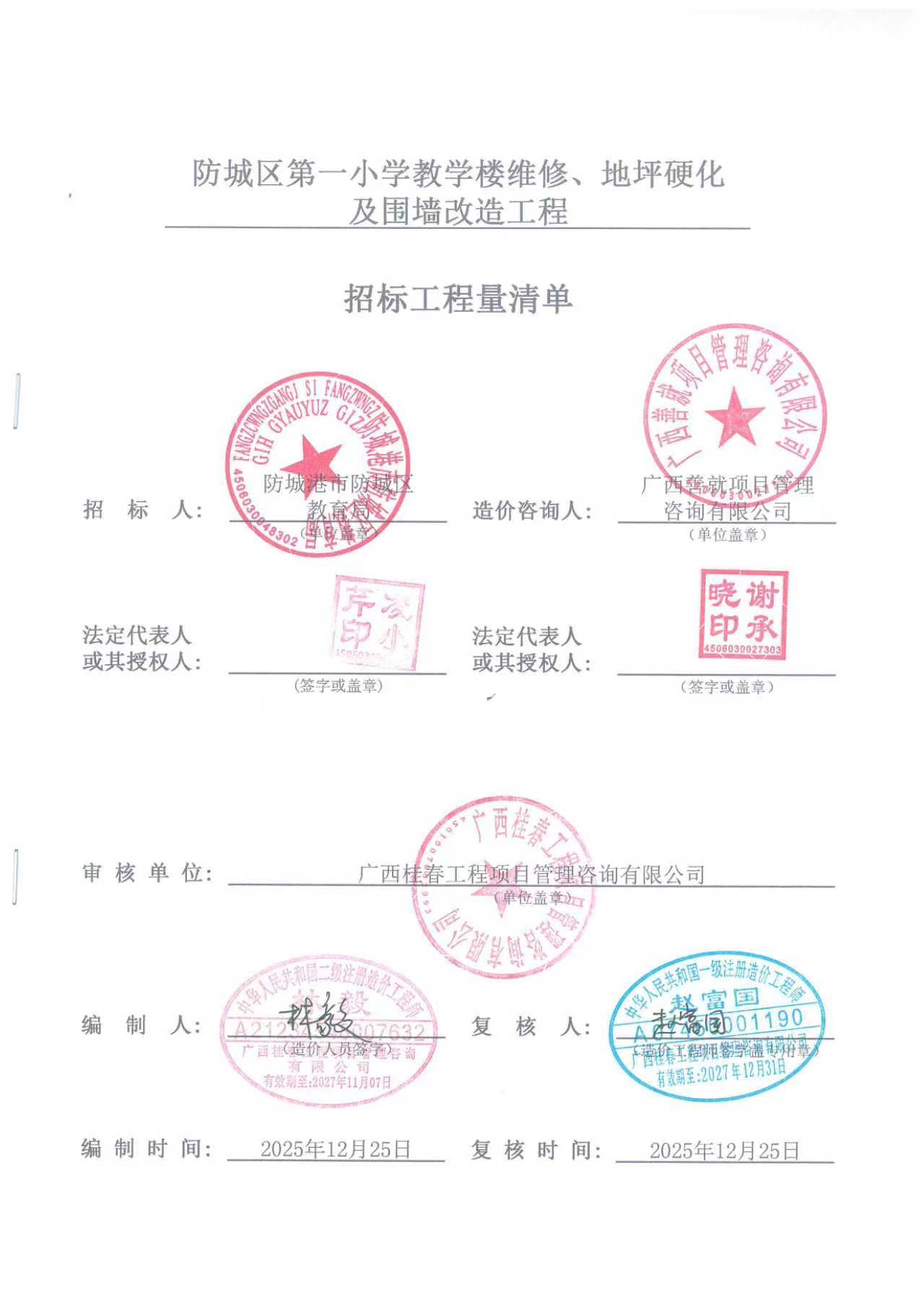 - 项目名称: 防城港市防城区教育局防城区第一小学教学楼维修地坪硬化及围墙改造工程